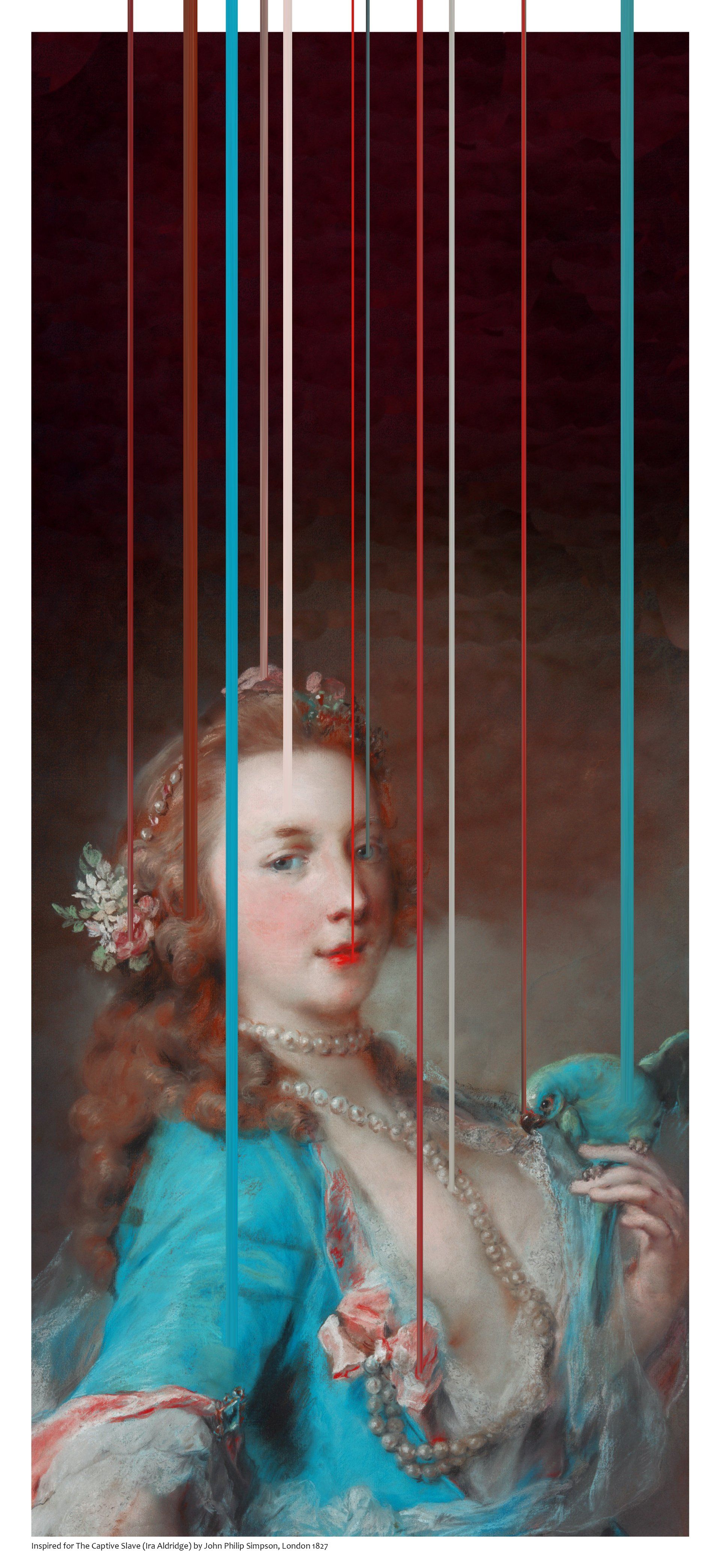 desafía nuestra percepción visual y cuestiona la realidad aparente de las imágenes. El tratamiento digital que el artista emplea, basado en la selección de píxeles de color, descompone y reconfigura obras de arte clásicas, creando una nueva realidad resignificada. Esta técnica refleja la mezcla de épocas y estilos, donde lo antiguo y lo moderno se fusionan en una ironía sobre la revelación de lo oculto.