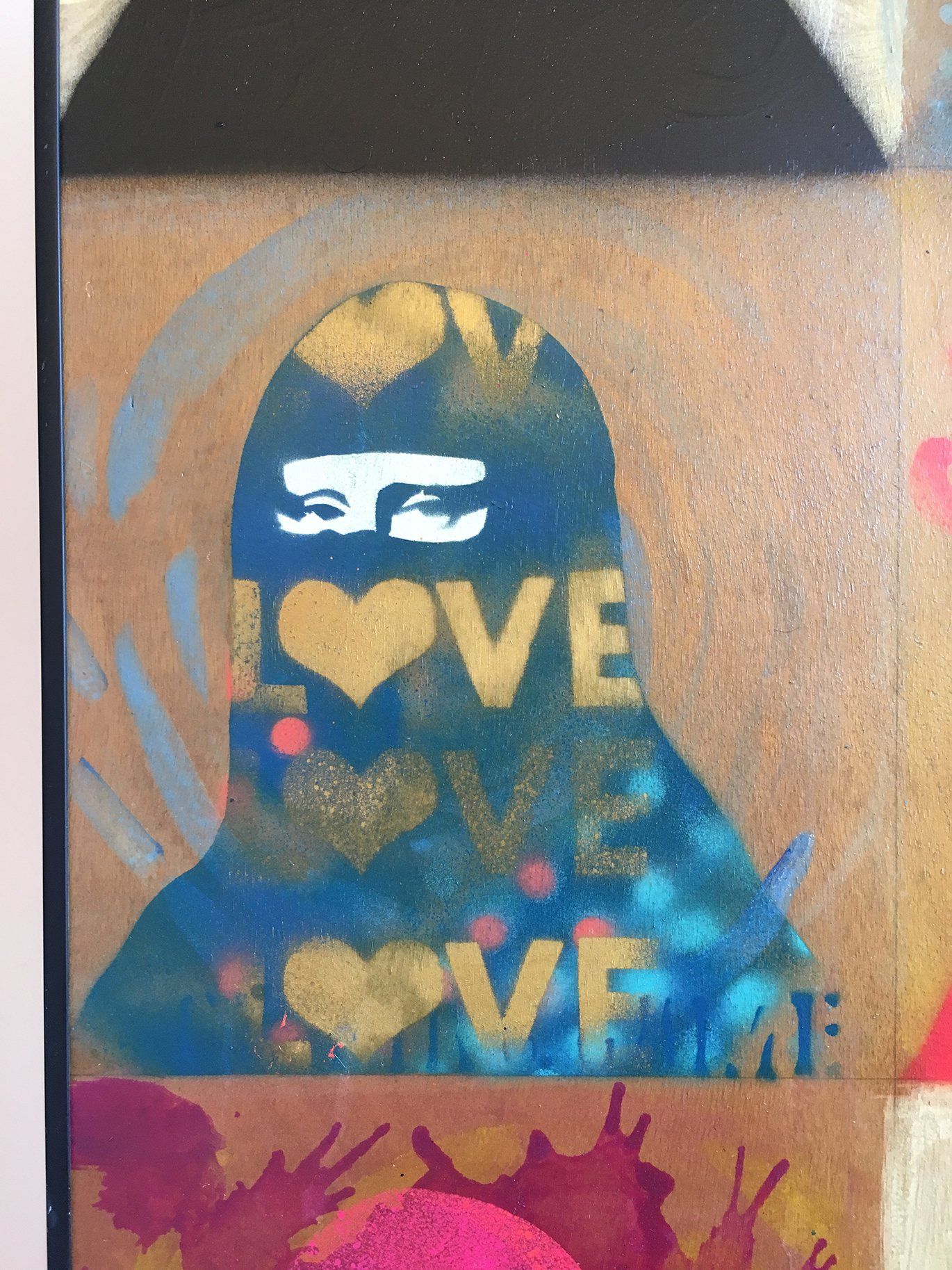 combina la estética del pop art con elementos de culturas islámicas, generando un diálogo visual poderoso. Esta interacción crea una dinámica entre la simplicidad de las emociones humanas y la profundidad de las construcciones culturales.